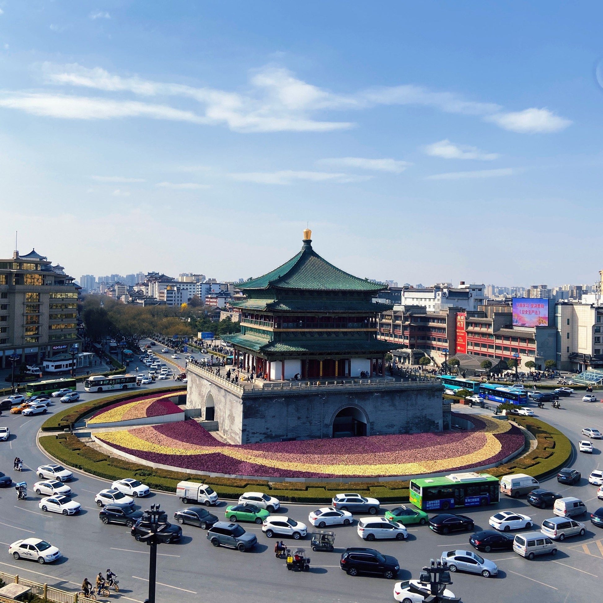 Upon ascending the Bell Tower, one can enjoy a 360-degree panoramic view of the bustling traffic on the four main streets, intuitively experiencing the square and symmetrical chessboard-like road network pattern of the ancient city, and comprehending the urban texture of Xi'an.